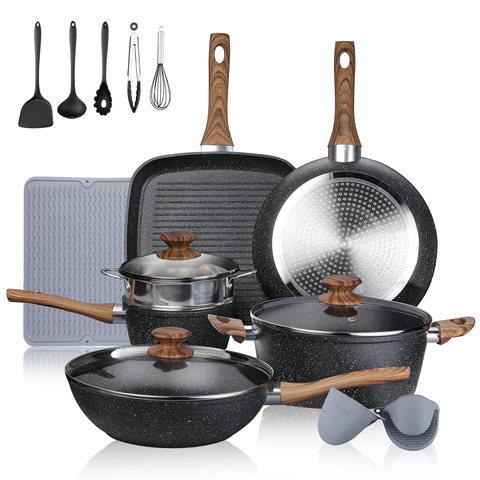 Ensembles d'ustensiles de cuisine antiadhésifs 16 pièces casseroles et poêles avec ustensiles et cuiseur vapeur ustensiles de cuisine en fonte antiadhésive avec poignées en bois